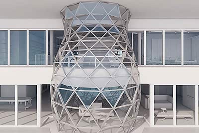 Engineering,design,fabrication and installation of 573 m2 single layer freeform facade with organic nodes and triangular members
