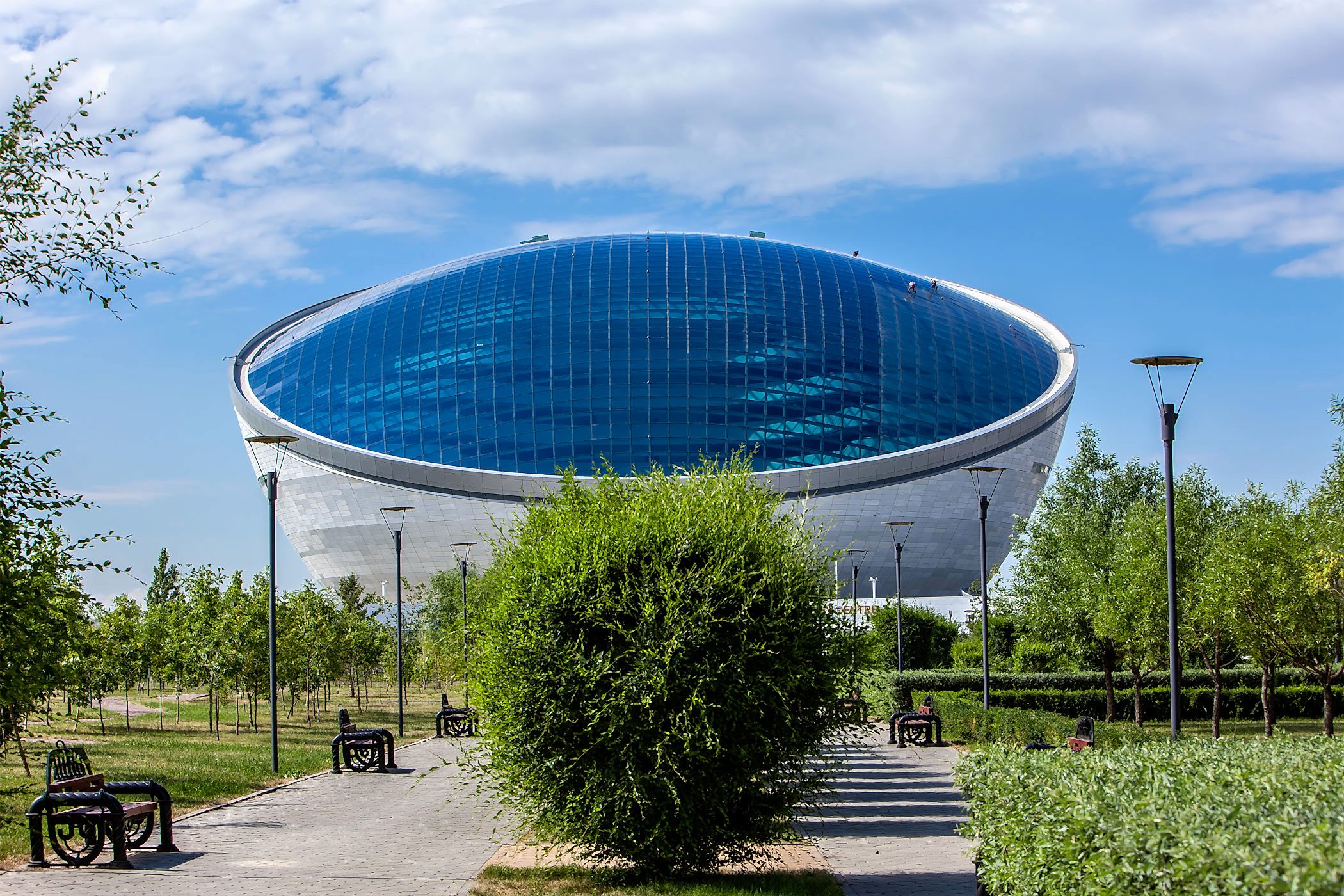 Engineering, design, fabrication and installation of 6.500 m2 double glazed single layer skylight in spherical form, installed onto a 90m diameter circular building with 20 deg. Slope. Steel member sizes are only RHS300x200